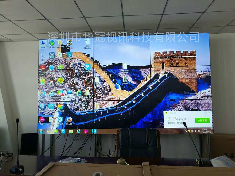 此套大屏采用的是9台(3列*3行)深圳华冠视讯46寸3.5MM超窄边拼缝的液晶拼接屏,该系列液晶屏采用原装三星进口DID液晶面板、内置拼接器、整机设计。机身轻薄易安装,同时也可节省安装使用空间。液晶拼接单元拼接单元具有可靠性强、稳定性高等特点,以保证系统安全稳定地运行。